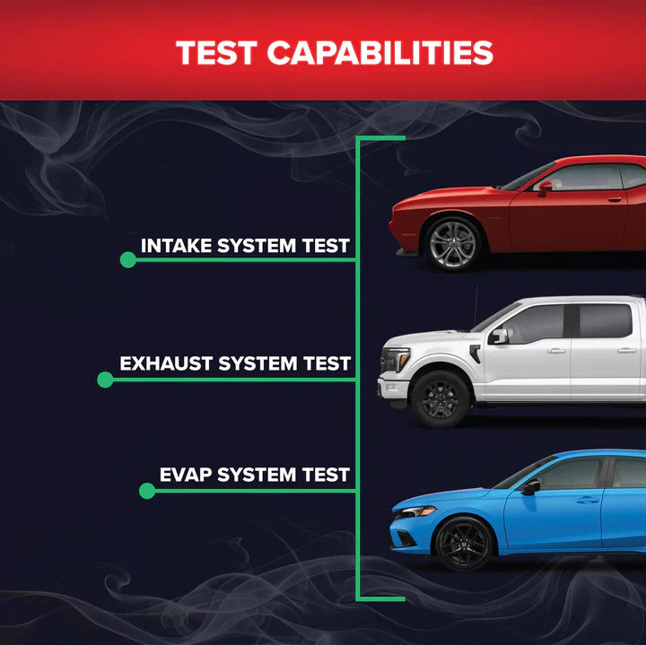 The SmokePro Total Tech 95-0050 is a professional grade lifetime tool that uses pressure, vacuum, and visual vapor to quickly diagnose trouble codes to pinpoint EVAP leaks, cooling system leaks, intake and exhaust leaks, wind, water oil leaks, saving you valuable time. Visible Vapor is the only way to find low pressure leaks, and this diagnostic leak machine can pinpoint Leaks Down to .010”.